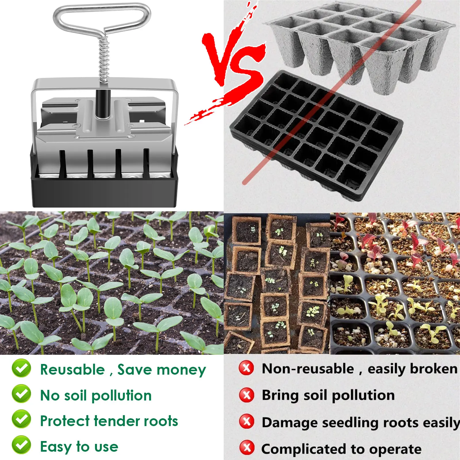 [Suitable for All Seeds] Potting soil is wet pressed into soil block molds and then discharged into trays using an ejection handle. The soil blocker can be made into potless pots, suitable for all seeds, and also for cuttings. When using the soil block, the roots are air pruned and transplant shock, stunted development and slow growth are greatly reduced.