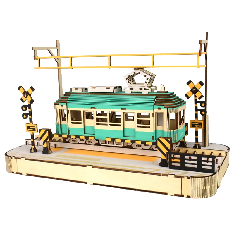 3D Wooden Puzzle Streetcar Sakura Journey Tram Station Retro Car Bus Model DIY Assembly Toys For Children Kids Desk Decoration