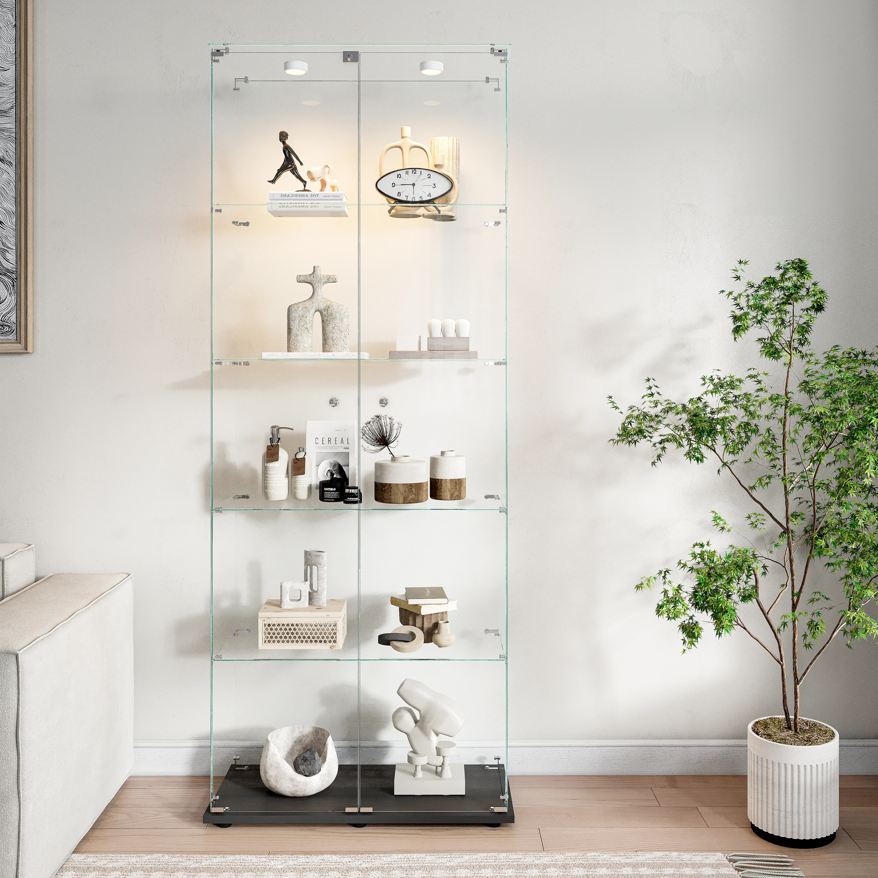 - Living Room Display Case with LED Lighting and Lock: Whether you’re storing important documents, valuable jewelry, or meaningful souvenirs, this glass display case with LED lighting and a lock offers added security. The integrated LED lighting illuminates your items, drawing attention and leaving a lasting impression on your guests or clients.