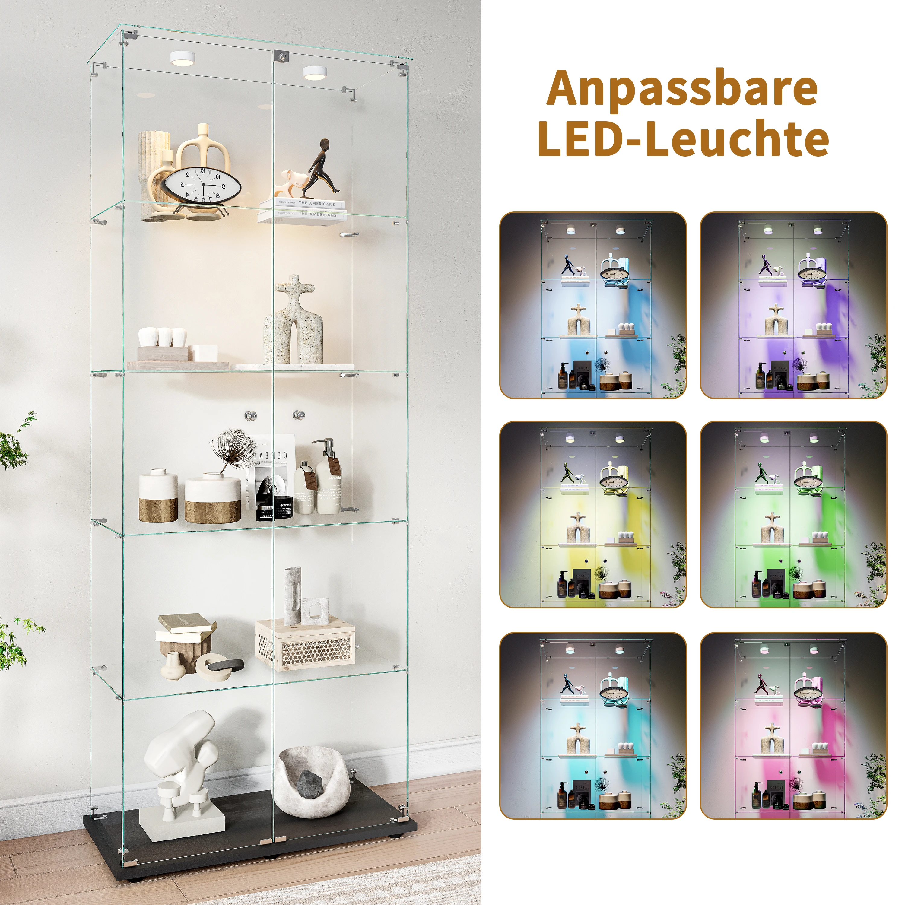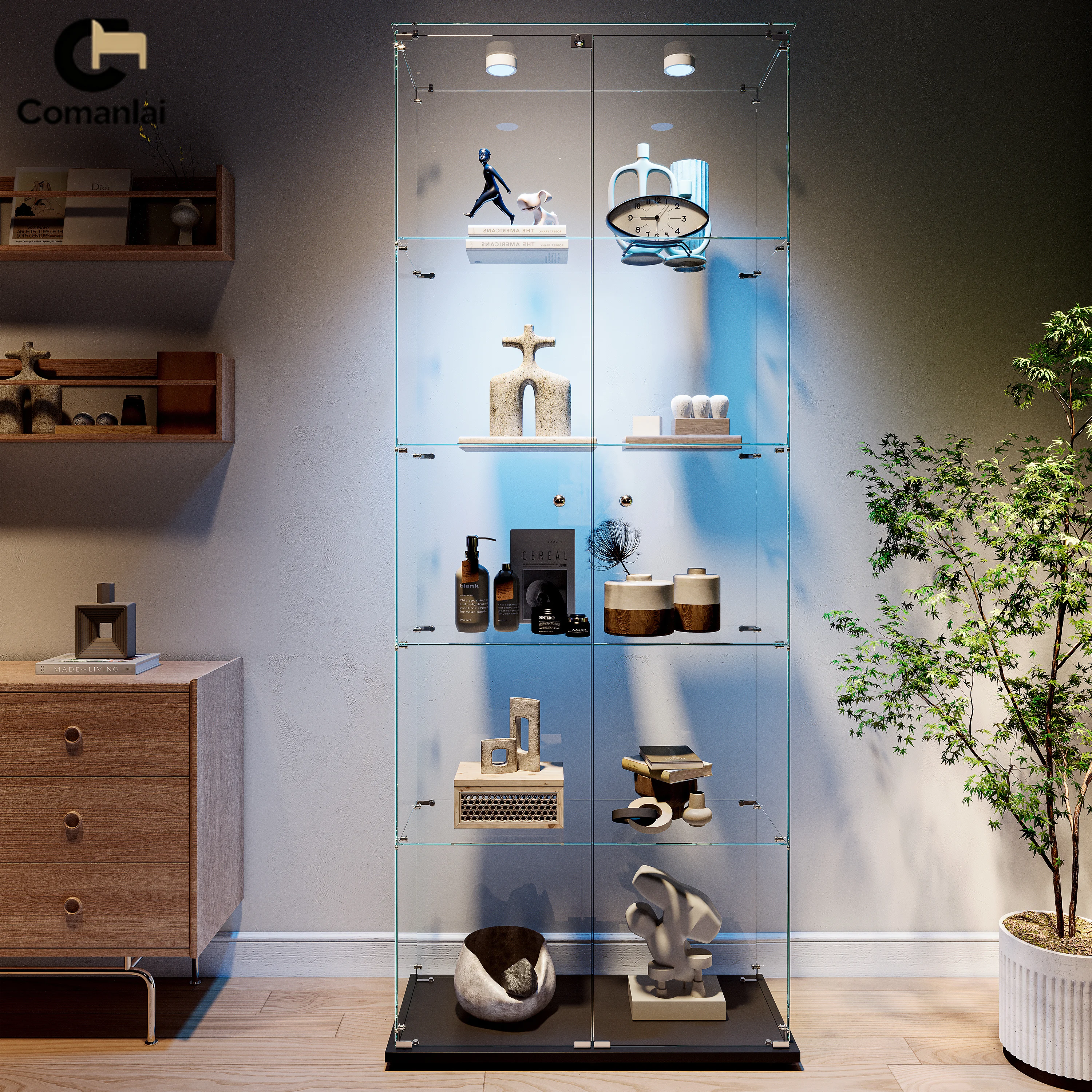 Comanlai 4-tier LED Glass display cabinet,Single/double door,Room Decor,storage shelf/display stand for collectibles,treasures