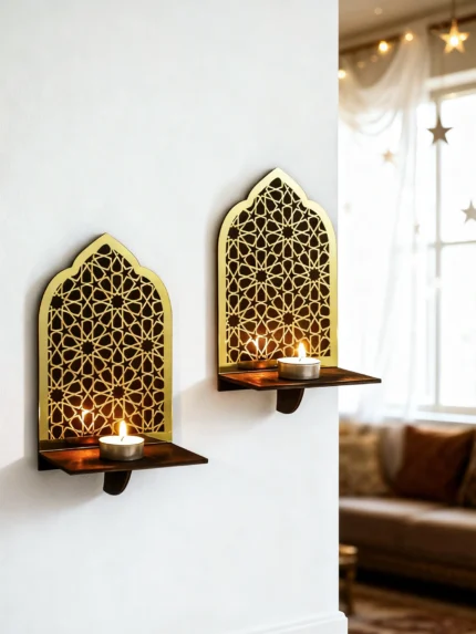 Islamic Ramadan Wood Wall Shelf Geometric Gold Black Acrylic Hanging Shelf for Eid Mubarak Kareem Candle Incense Home Decor Gift