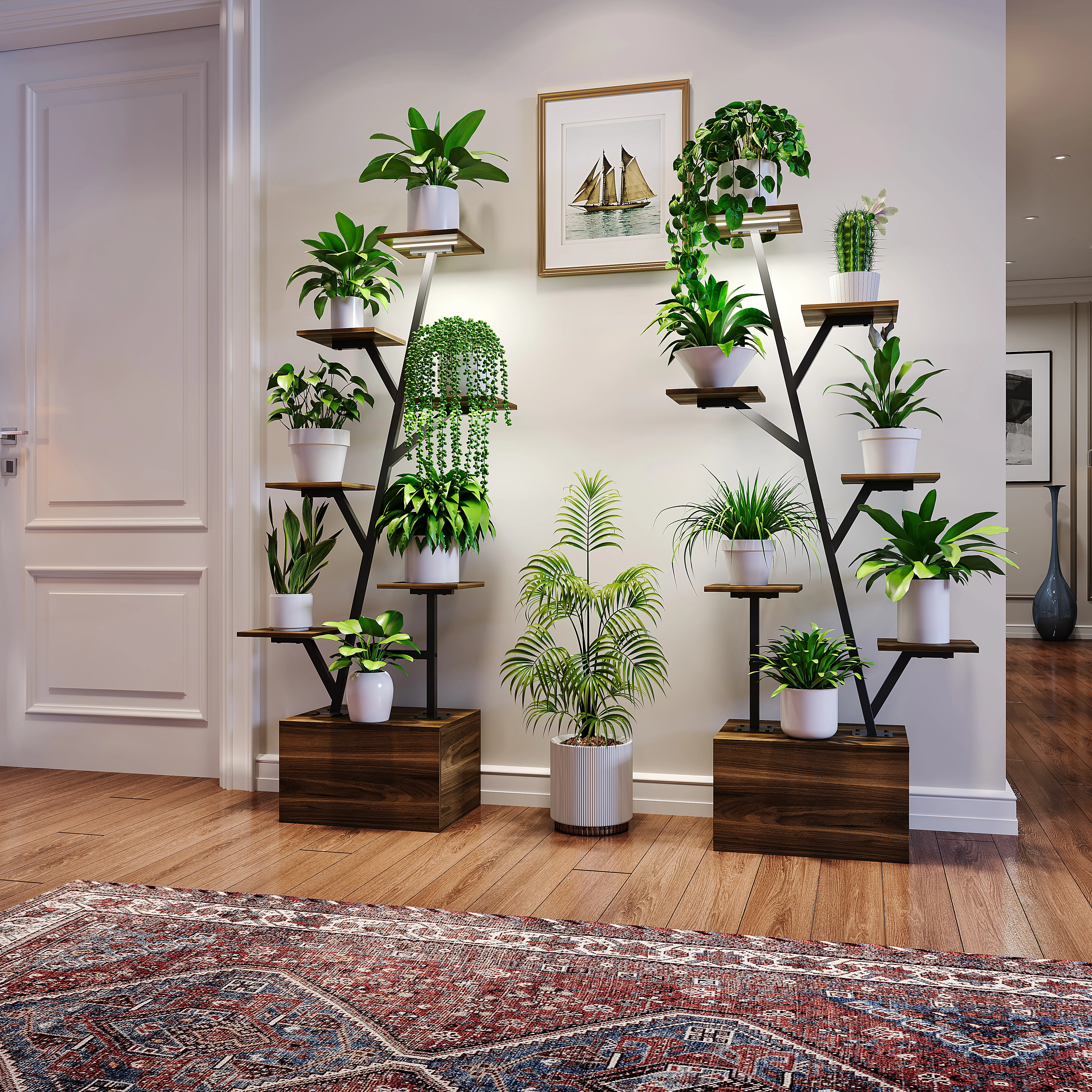 3. Suspension design: Unique suspended plant display function design, with hanging racks on both sides of the top that can display hanging potted plants, further enhancing the decorative effect and saving space.