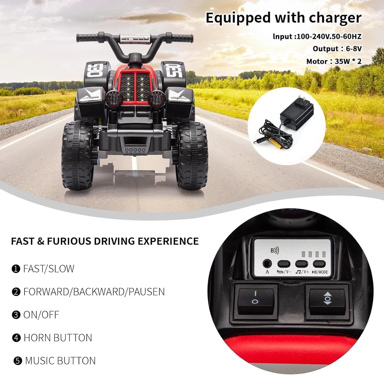 — Electric Quad for Kids with Battery Power This 6V electric quad brings children's eyes to light! With a rechargeable battery and up to 50 minutes of driving time, it means: full throttle for small adventurers – completely without gasoline smoke, only with pure fun factor.