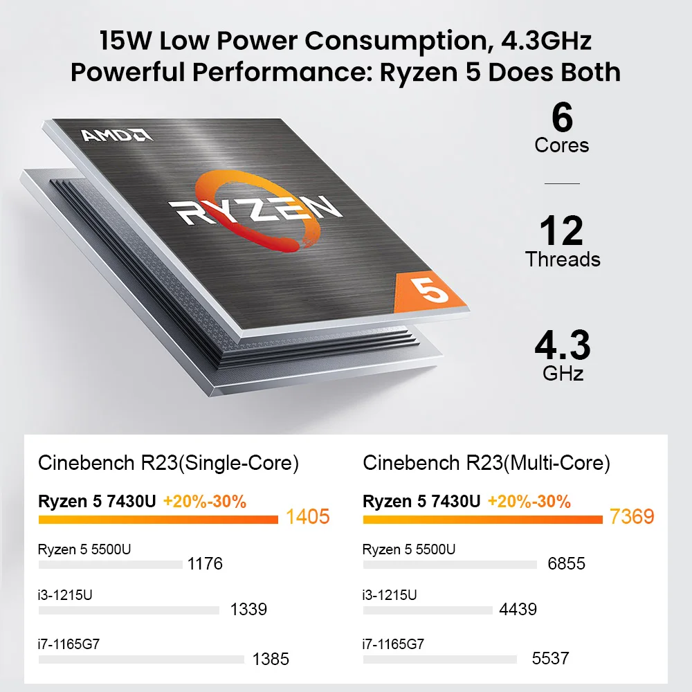The A15 Pro laptop is equipped with an AMD Ryzen 5 7430U processor, 6 cores and 12 threads, and a main frequency of 4.3GHz. It can easily run various office software and some games.