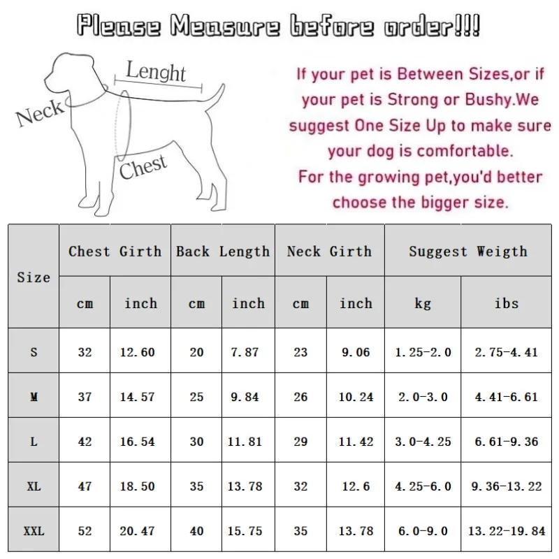 XXL: Chest 52cm/20.47'' ; Length 40cm/15.75'' ;Neck Girth 35cm/13.78'';Suggest Weight 6.0-9.0 kg/13.22-19.84 lbs.