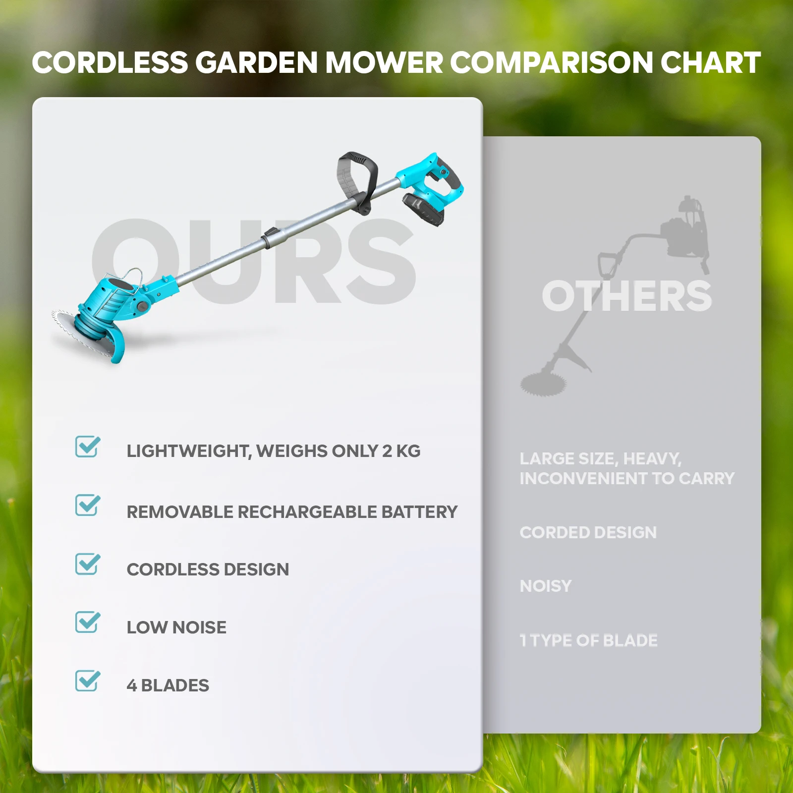 This portable lawn mower weighs only 2 kg and will not cause additional load on your arms when using it. The high power engine of can provide a speed of up to 9,000 revolutions per minute. The two large-capacity 5*1500 mAh lithium batteries can provide the lawn mower with 60 minutes of continuous operation time, and it only takes 2-3 hours to fully charge the battery.