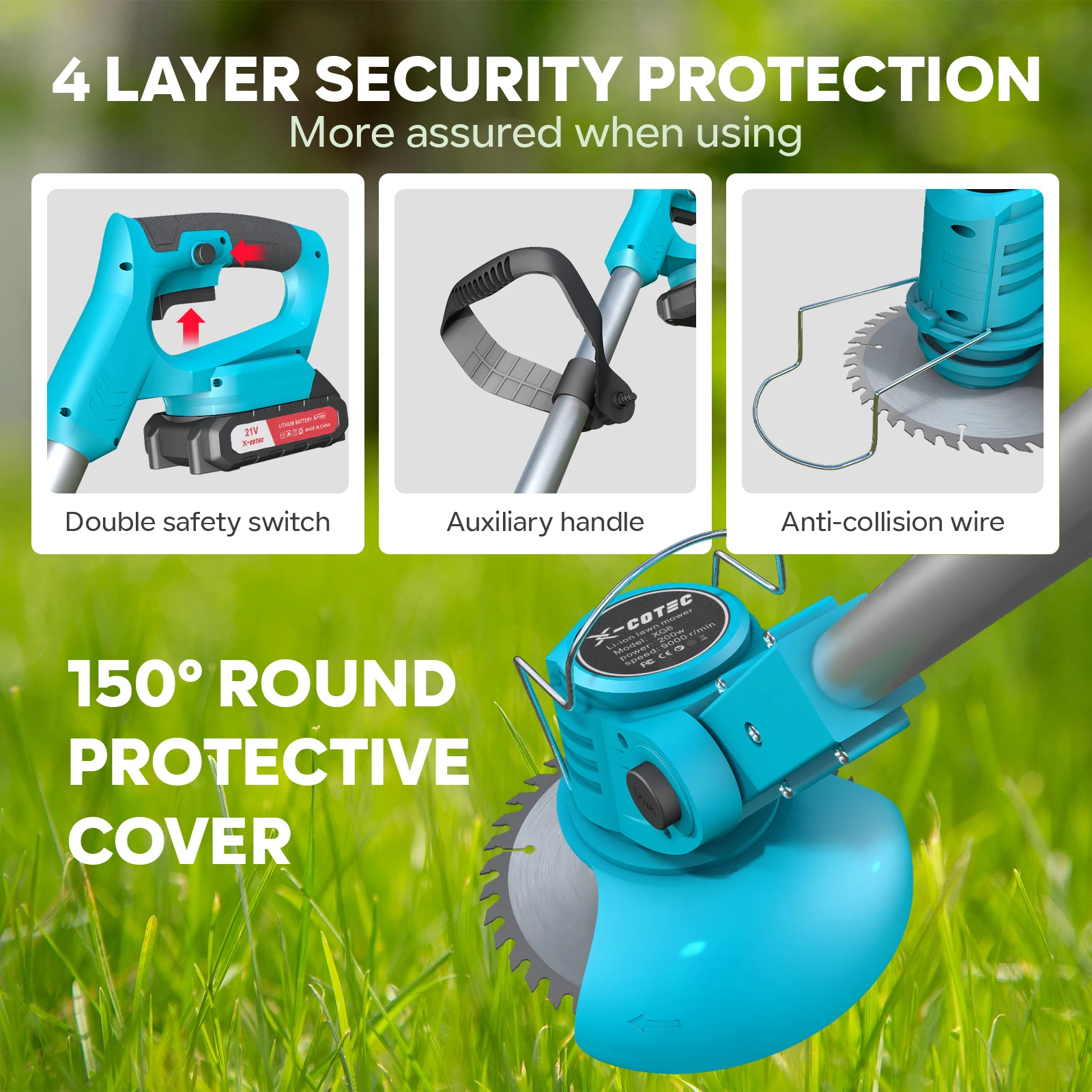 The dual start-up switch to a large extent guarantees the user’s security and avoids injury caused by an accidental start-up. The lawn mower can only be started by pressing both switches simultaneously; the 150 ° protective hood can block most grass mowers and flying drink chips; the auxiliary mobile handle can adjust the fixed height according to the user’s usage habits, size and other factors, Which constitutes a very ergonomic design; Anti-collision thread can prevent the blade from touching hard objects such as stones when the lawn mower is in use, causing damage to the blade and bodily injury.