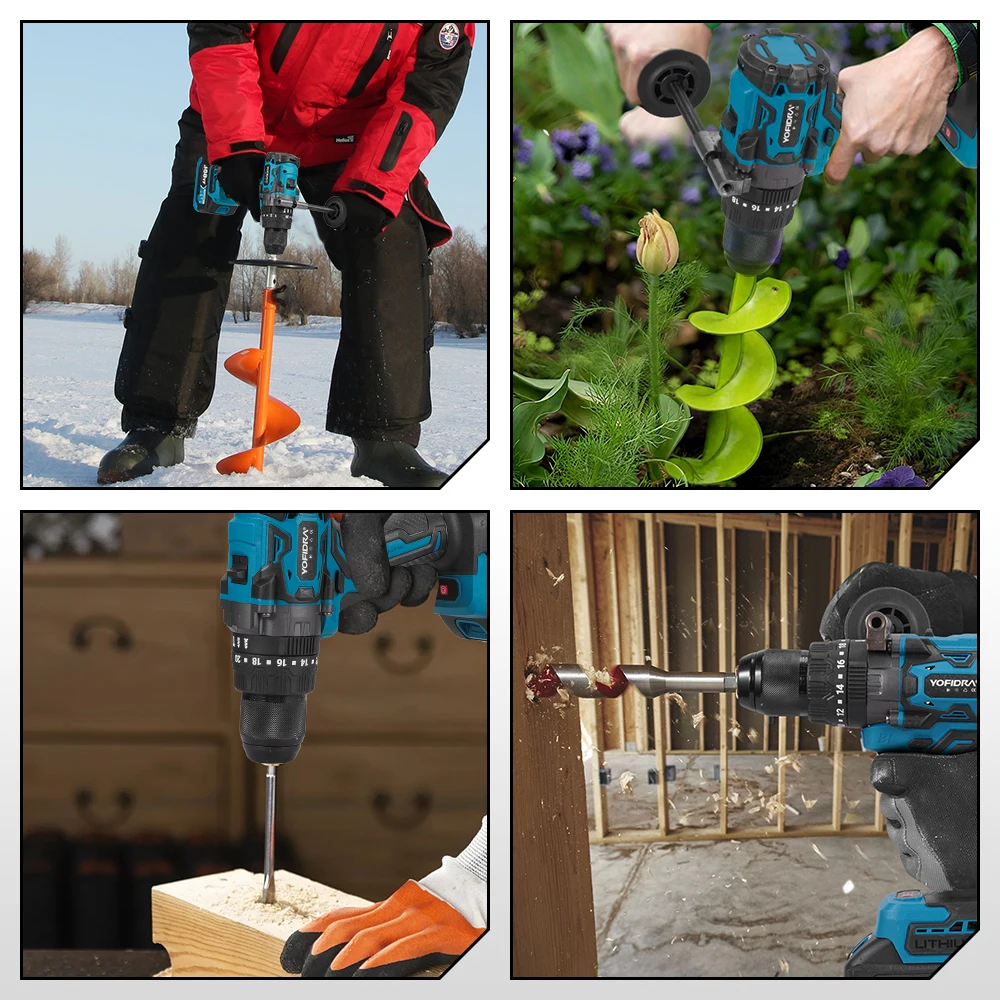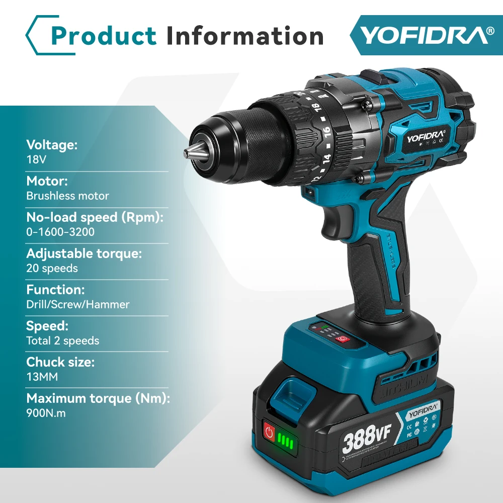 YOFIDRA 900N.M 3200RPM Brushless Electric Impact Drill 13mm Hammer Drill Cordless Screwdriver Tool For Makita 18V Battery Pin